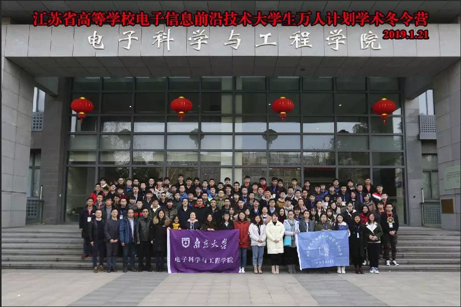 为贯彻《中共中央办公厅国务院办公厅关于深化教育体制机制改革的意见》精神,服务国家创新驱动发展战略,落实立德树人根本任务,推进产学研合作协同育人,着力培养各行各业未来领军人才,江苏省教育厅启动高等学校大学生计划,开展2018-2019年学术冬令营活动。我校信息院共5名同学:电子信息工程:160802108杜维,物联网工程:160805320吴倩文、160805326张慧、1603A0507侯虎,电气工程及其自动化:160803127于慧振,通过校内推荐和南京大学专家组审核选拔,最终入选了江苏省高等学校电子信息前沿技术大学生计划学术冬令营。2019年1月21日上午9点,冬令营启动仪式在南京大学电子科学与工程大学生 报告厅举行